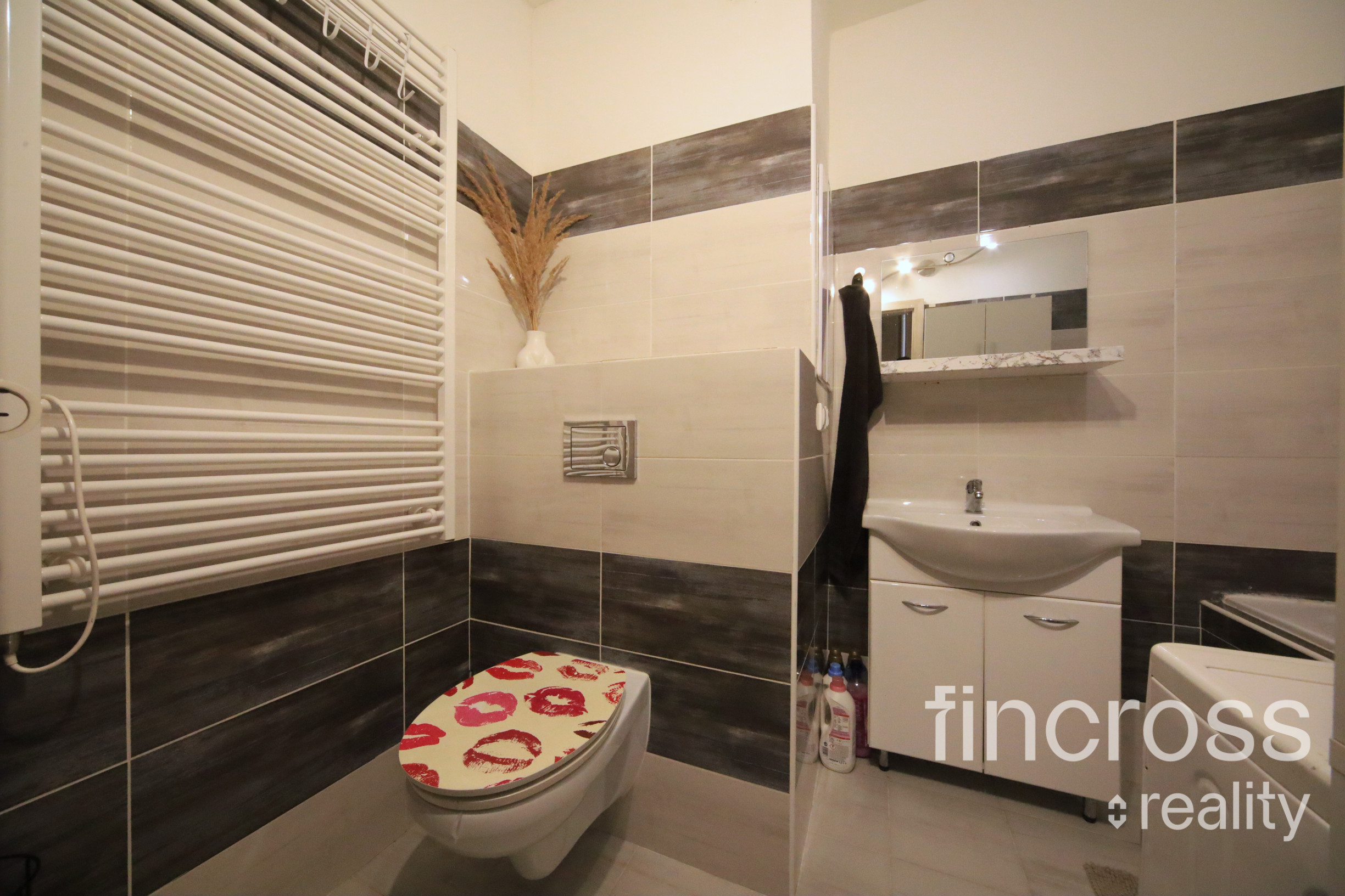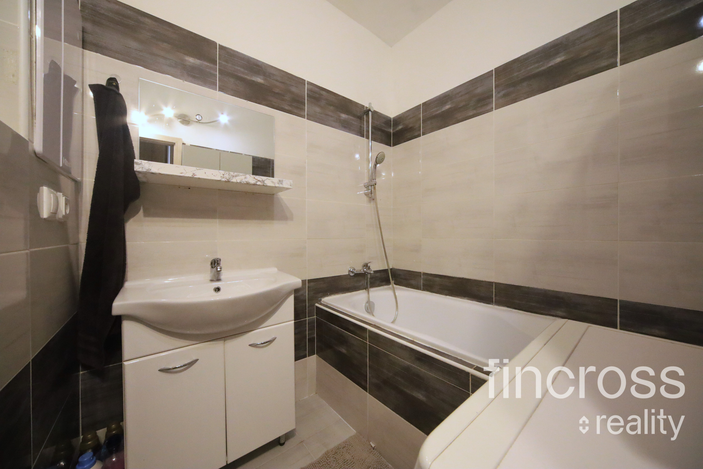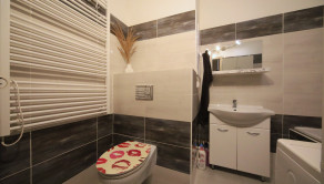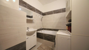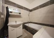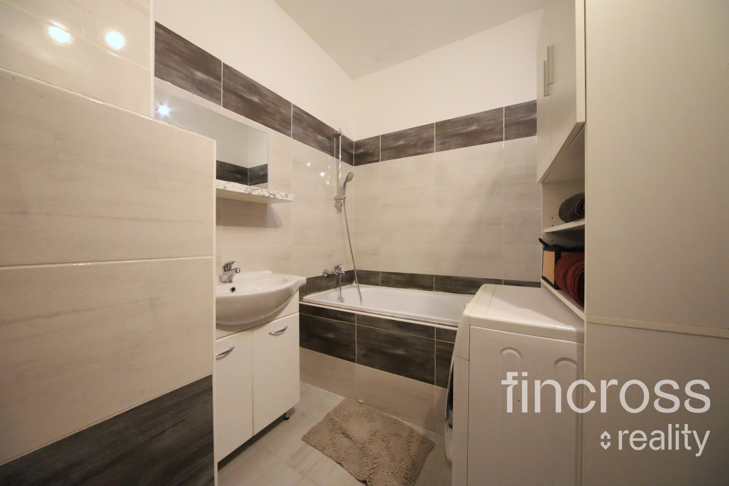 praktická kúpeľňa s vaňou, umývadlom, WC a priestorom na práčku aj úložné riešenia